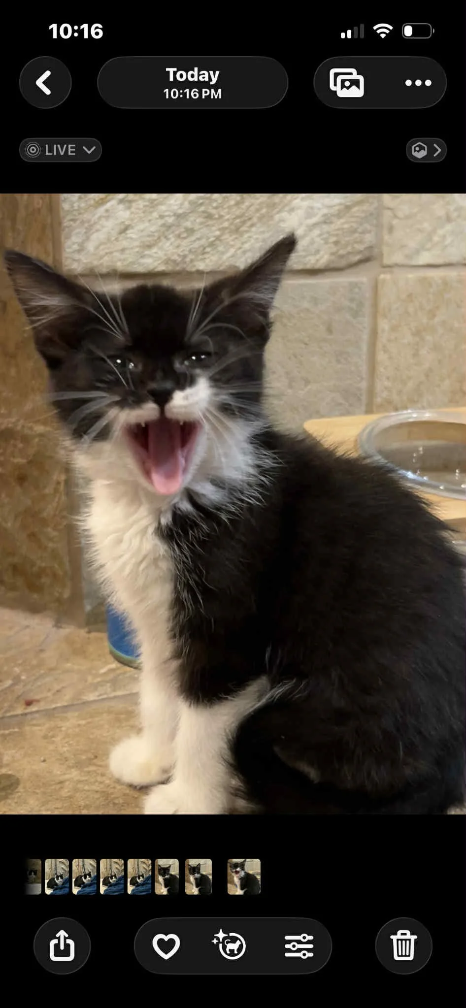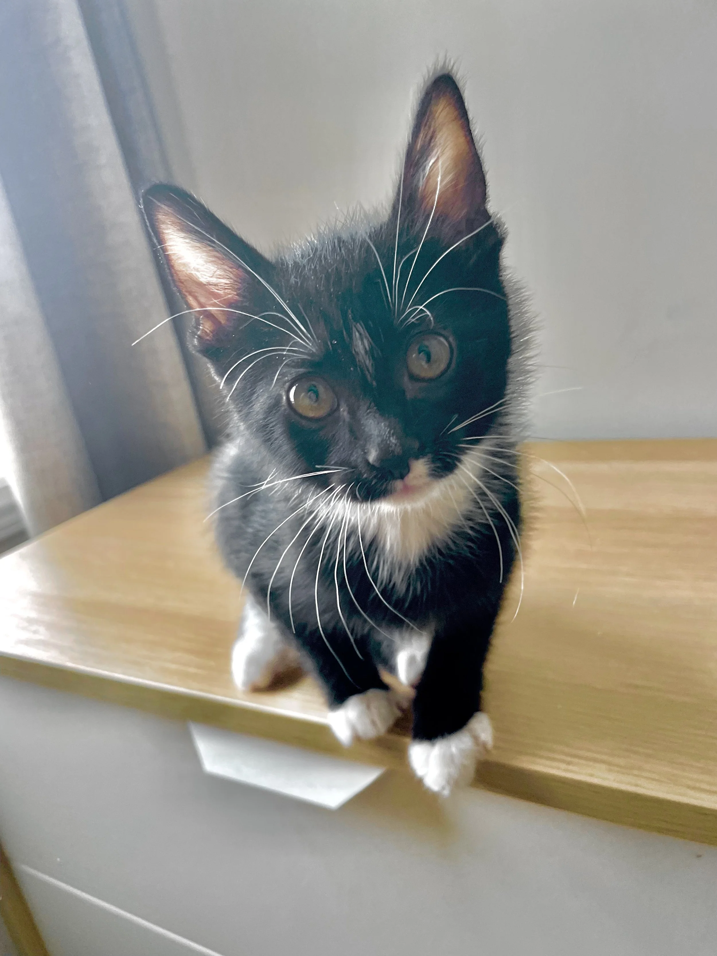 Evee is a young female kitten who was rescued from the cold outdoors. She is a tuxedo kitten so she is always ready to party!