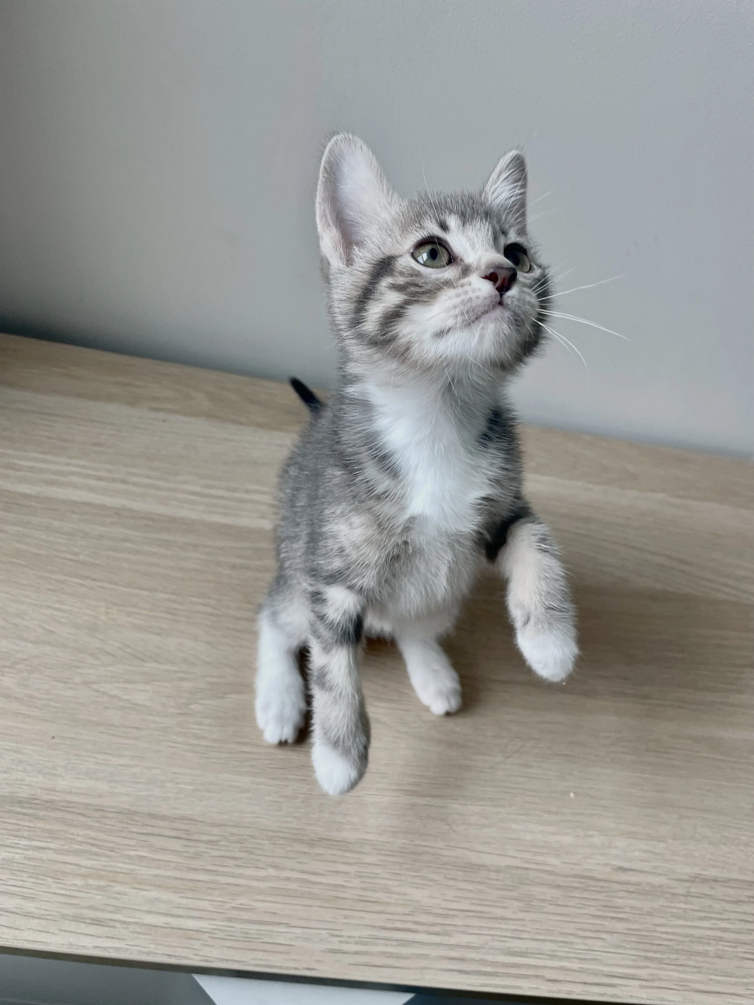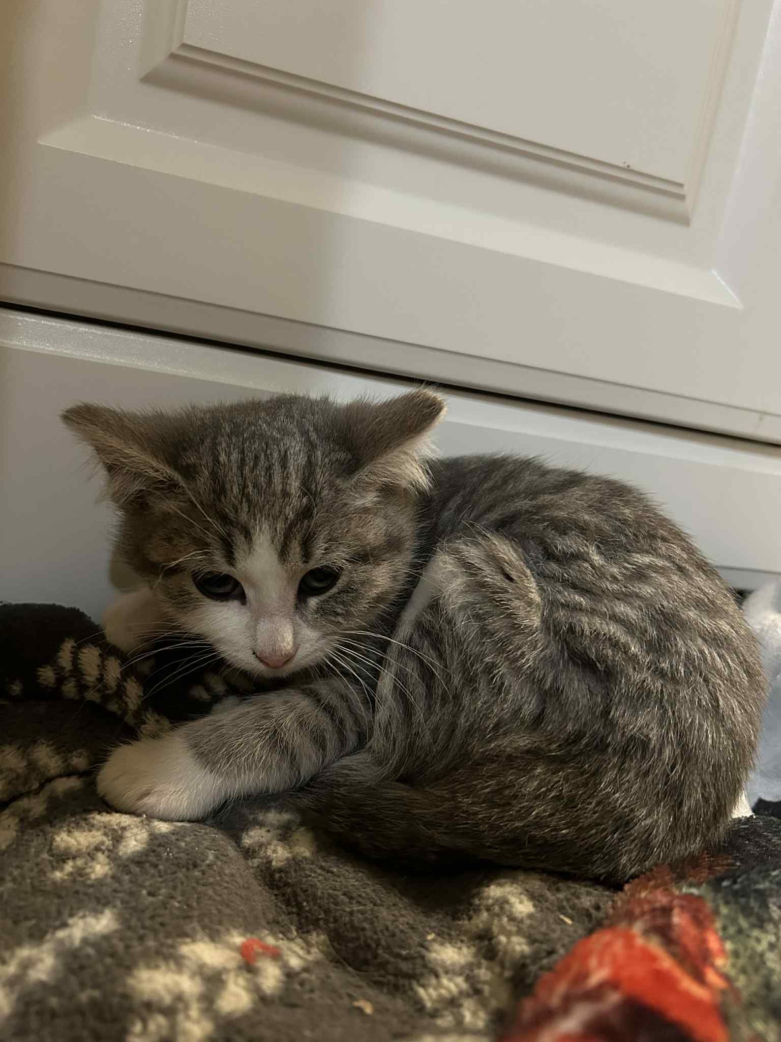 Mew is an adorable gray and white tabby kitten. She was found with her older brother Brock outdoors before the big snow storm happened