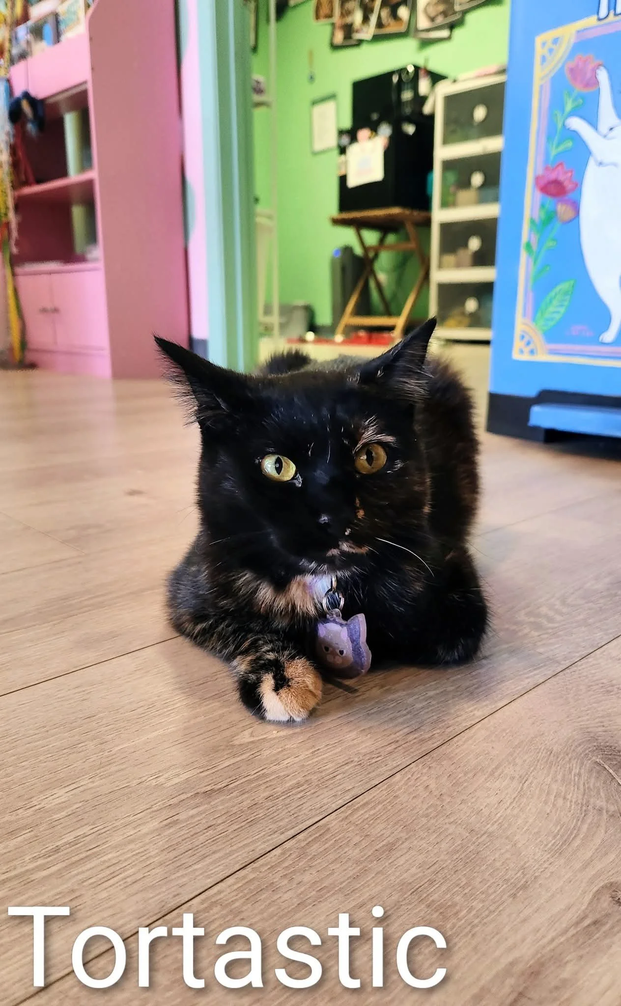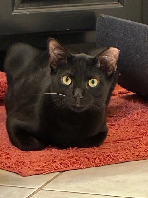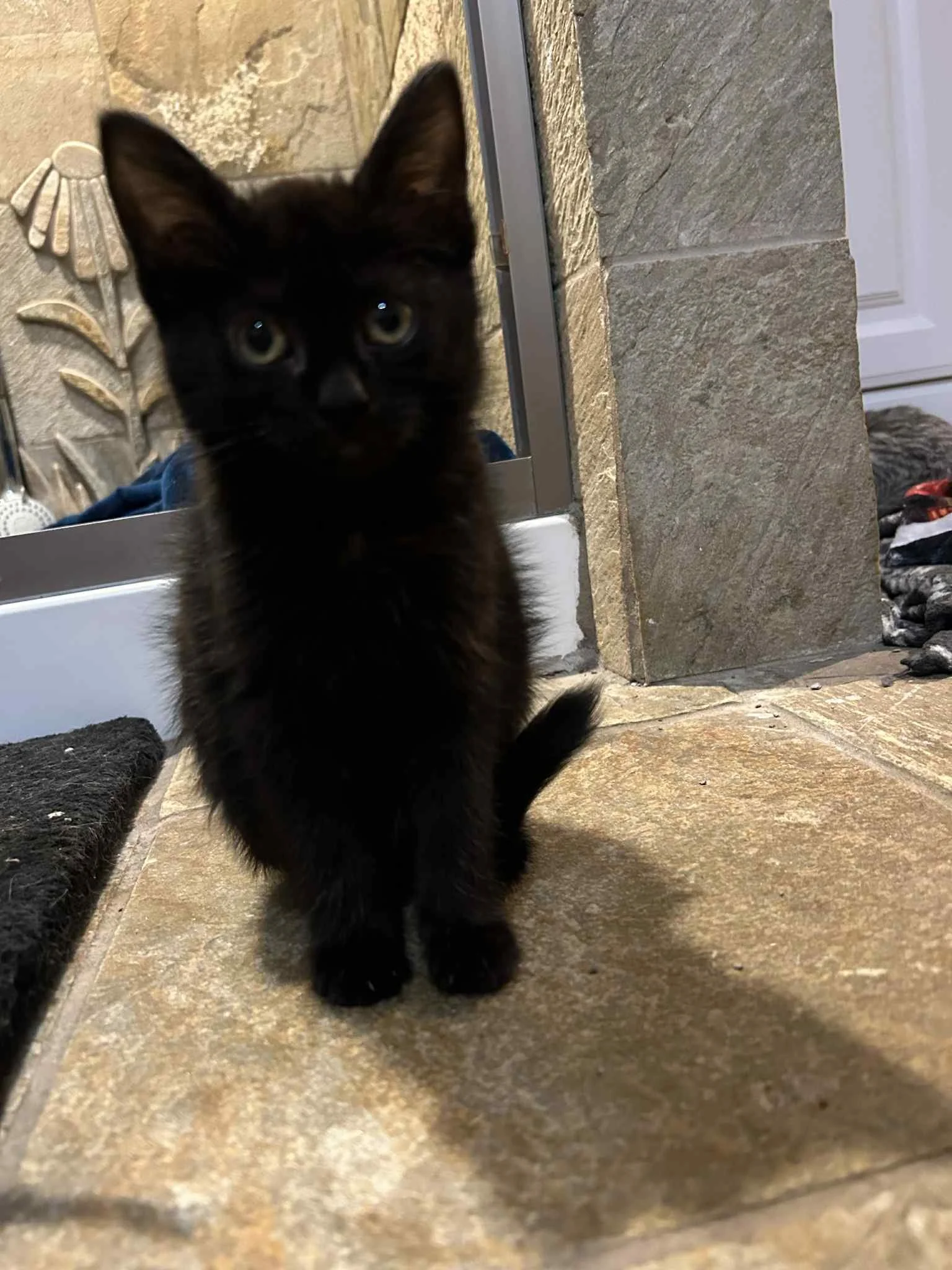 Togi is a black kitten who was rescued from outside along with his sister Togi. He is adoptable through St Sophia’s Forgotten Felines Rescue